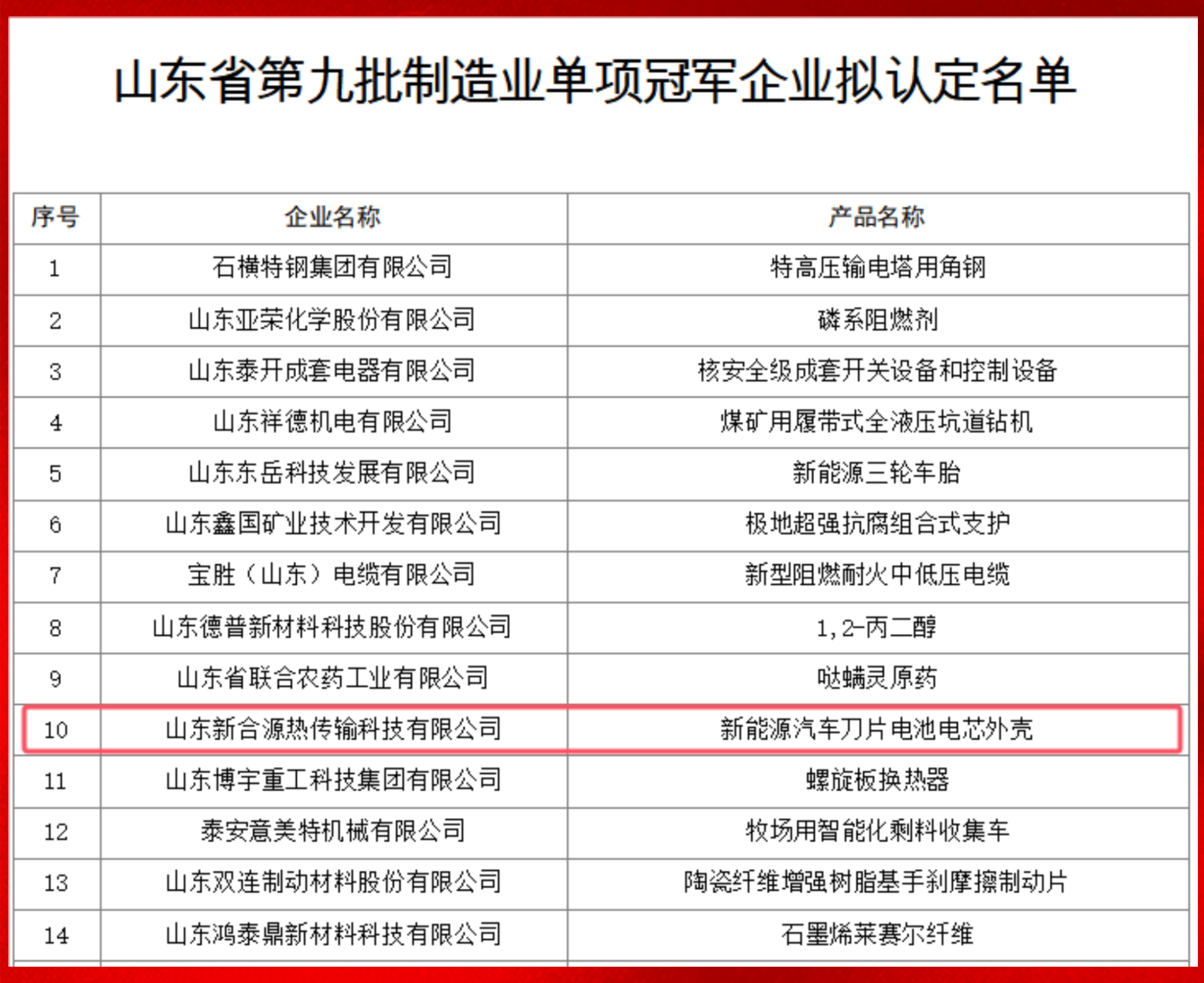 11月25日,山东省工业和信息化厅发布《关于第九批山东省制造业单项冠军拟认定名单和第三、六批复核拟通过名单的公示》。山东新合源热传输科技有限公司凭借在新能源汽车电池壳体制造领域的深厚积淀与突出综合实力,成功跻身第九批山东省制造业单项冠军企业拟认定名单,其在细分领域的领先地位获权威认可。